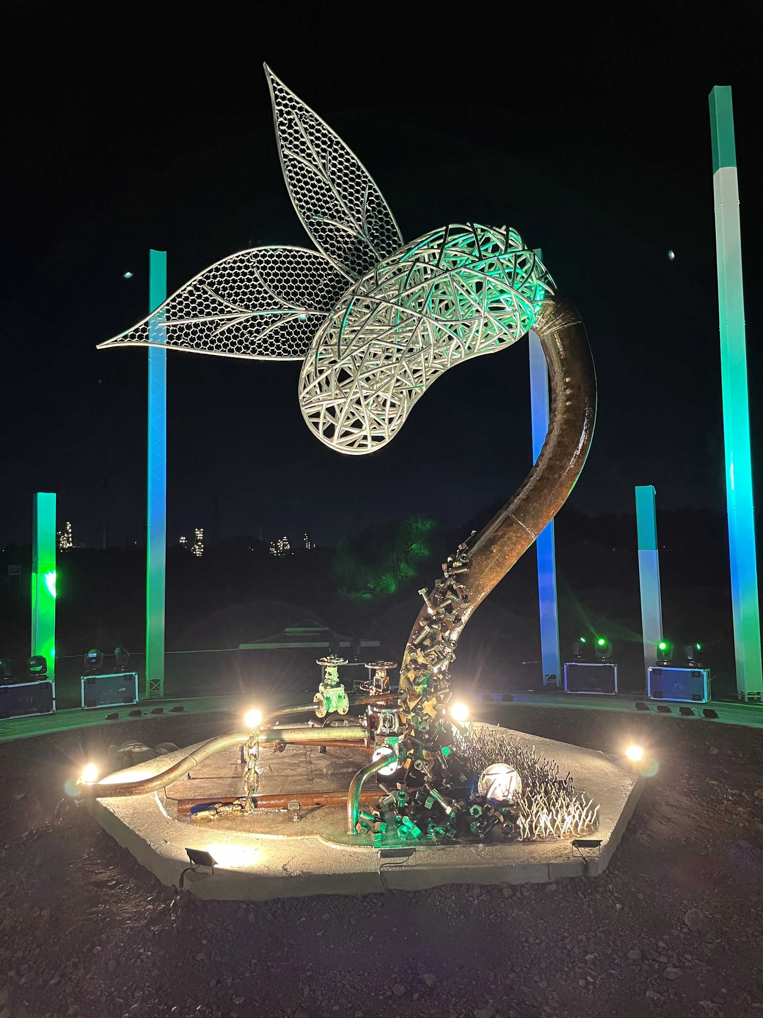"Semilla" is a sculpture made of scrap metal from the 100-year-old oil refinery that recently closed in Curacao, which has now been transformed into a sustainable business center.