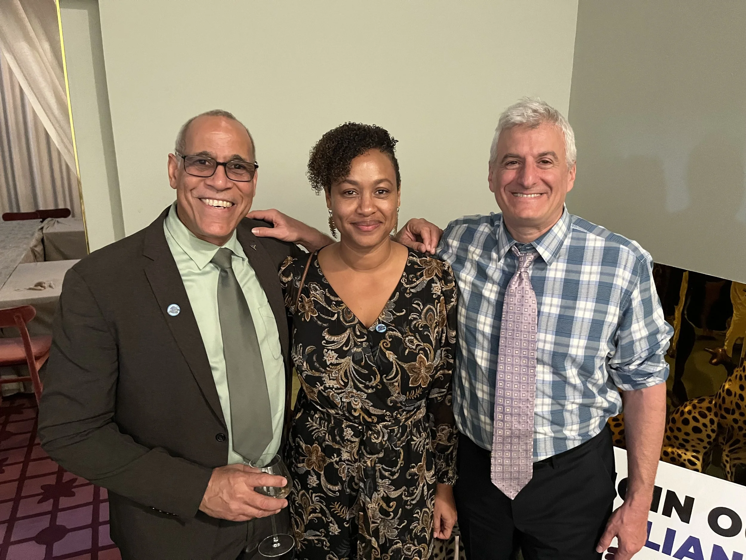 Caribbean Climate-Smart Accelerator Director of Public-Sector Projects Kiesha Farnum (middle) with Permanent Representative of Curaçao & St Maarten to the World Meteorological Organization (WMO) Albert Martis (left) and Brooklyn Story Lab CEO Lance Gould (right)