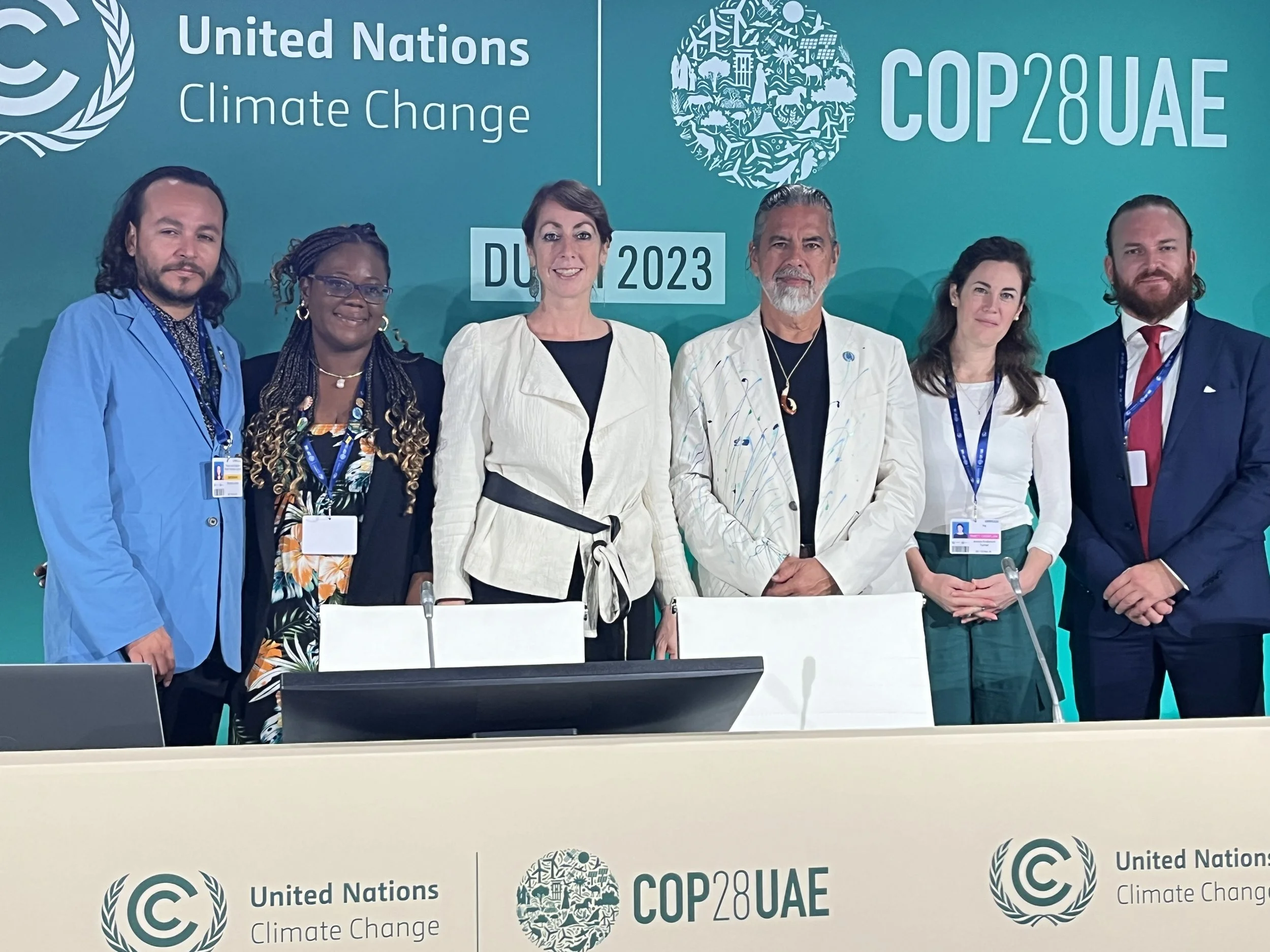 Peace Boat US Director Emilie McGlone (third from left) at official UN COP28 press conference, with (from left), Roberto Cerda, member of Mexico´s National Committee for the UN Decade of Ocean Science for Sustainable Development; Khadija Stewart, Blue Planet Global Ambassador; Henk Rogers, Founder, Blue Planet Alliance; Jessie Turner, UN Foundation’s Executive Director of the International Alliance to Combat Ocean Acidification; and Peter Houlihan,