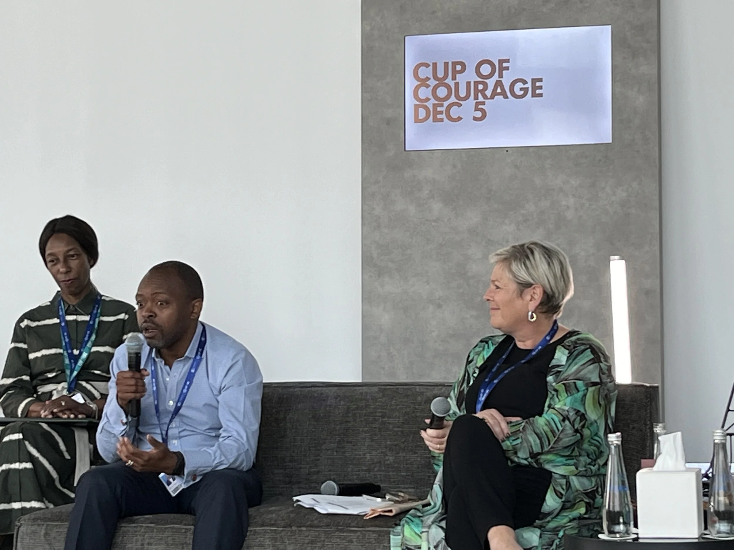 Halla Tomasdottir (right), CEO of The B Team, leads a “Cup of Courage” session at COP28, featuring James Mwangi, Founder, Climate Action Platform for Africa (CAP-A)