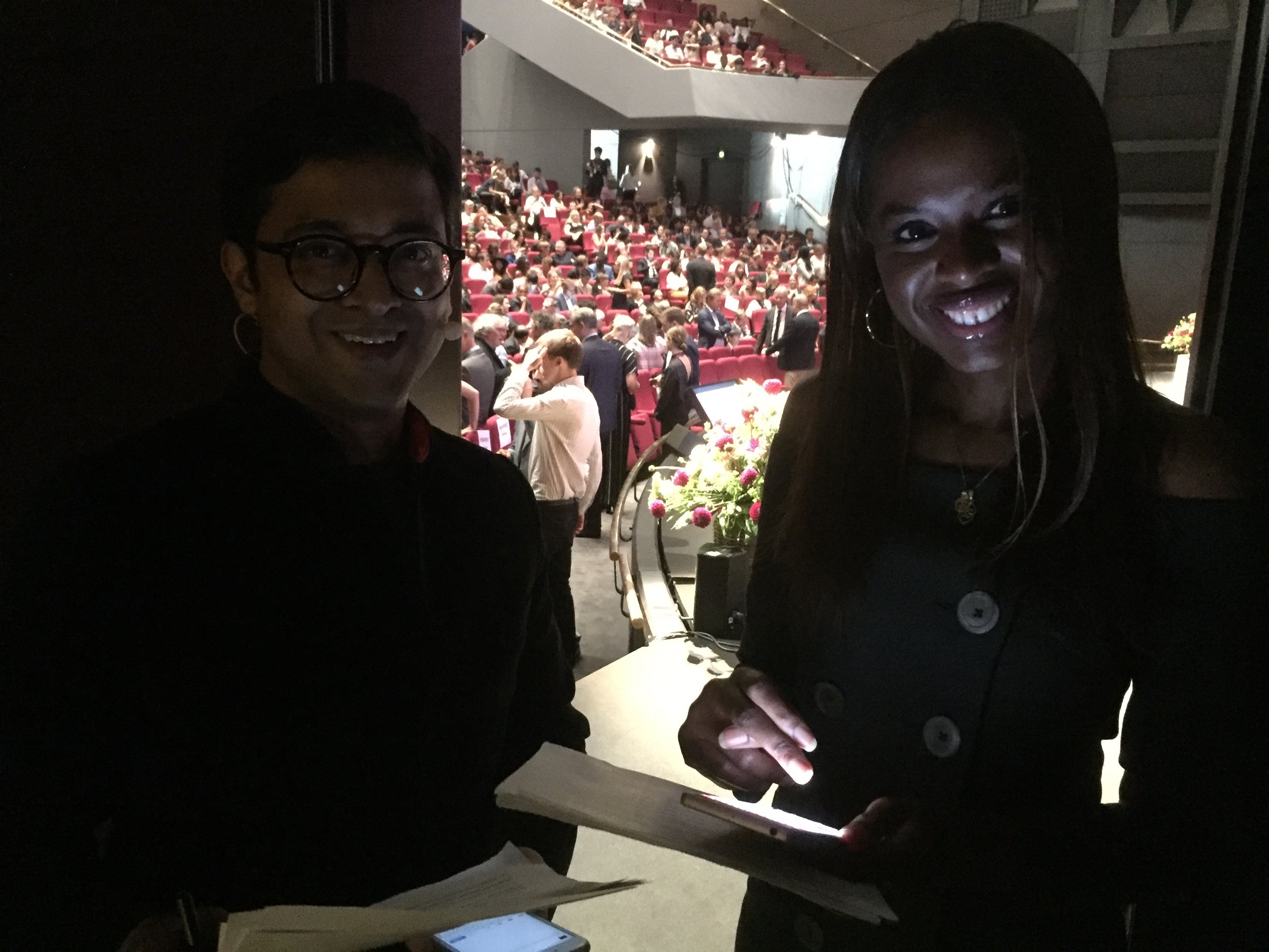 UNLEASH Innovation Lab 2017 closing ceremony co-hosts, Gaurav Gupta and June Sarpong, and “Voice of God” Lance Gould, at Aarhus Musikhuset.