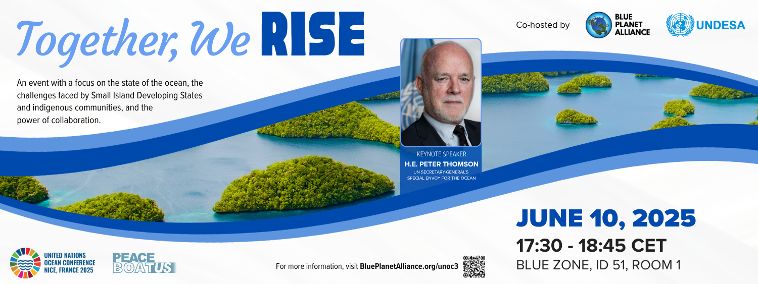 Project: “Together, We Rise” was an event at the 2025 UN Ocean Conference in Nice, France, that examined Small Island Developing States’ priorities, featured global leaders, and advanced cross-sector collaboration. Partnership among global stakeholders — public and private sector, local communities and youth — is key to overcoming these challenges to ocean health, so that together, we rise.